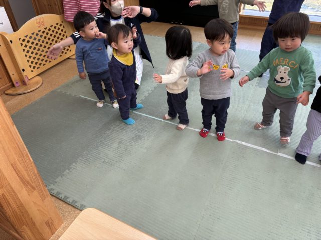 みんなの大好きな「ワンツーパンツ-!」「ばななくんたいそう」の曲に合わせて発表会ごっこを楽しんでいます。
