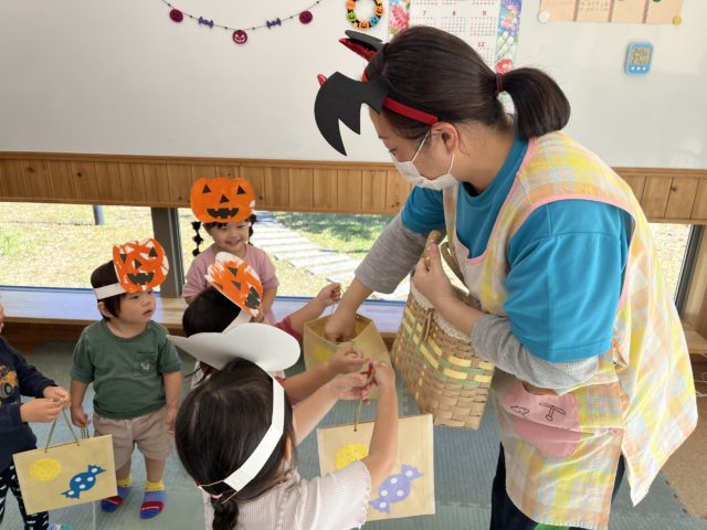 みんなも手づくりお面とお菓子入れバックを持って、お菓子を持っている先生の所へいって