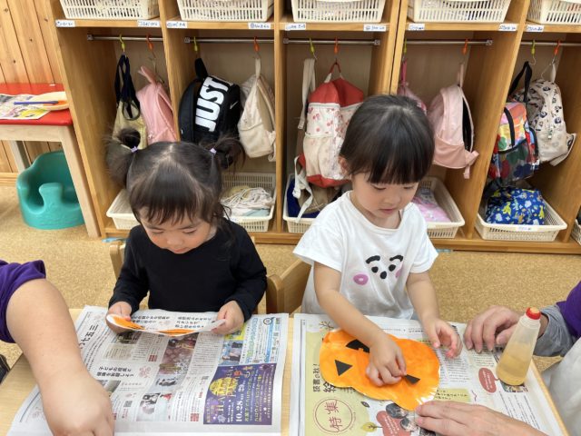 お菓子を入れる袋も作り、お面も作り、みんなは「ハロウィン」「おばけ~」と31日を