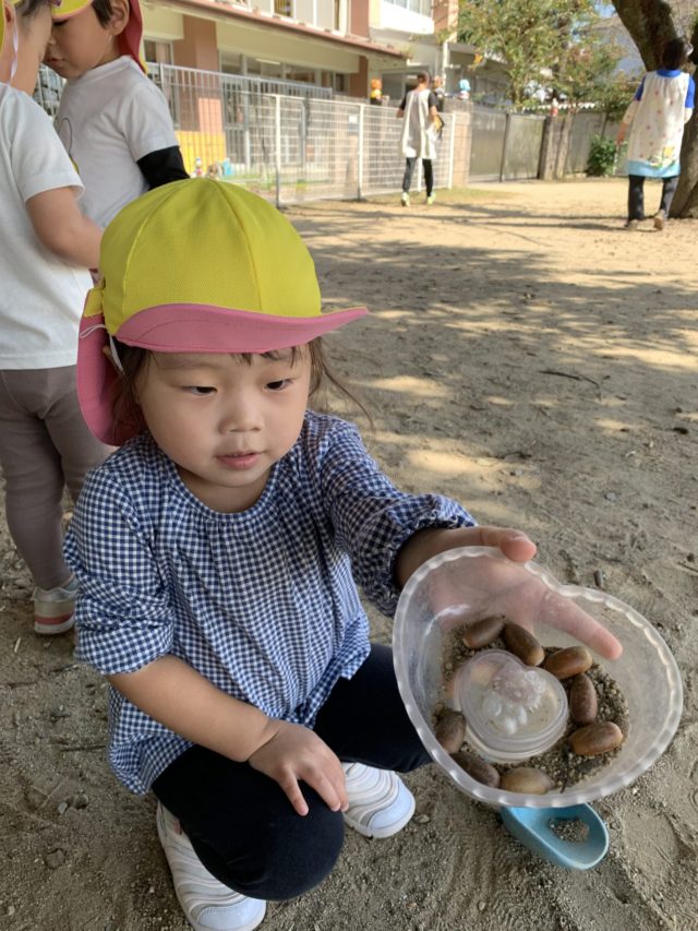 ねえ、見て見て、どんぐりたくさん集めたよ。