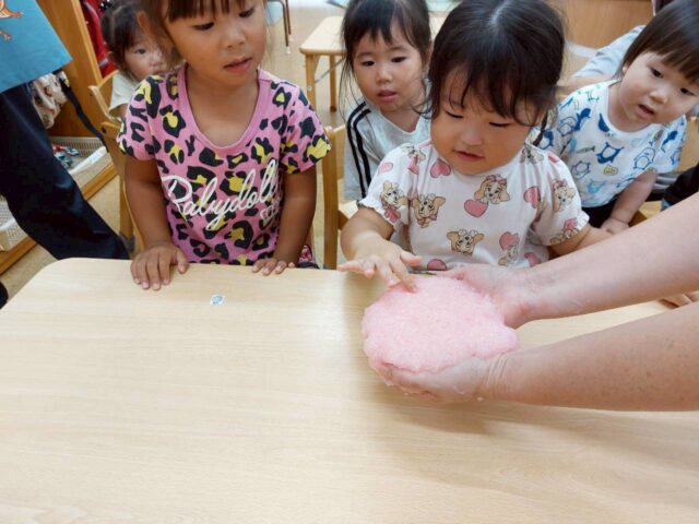 出来上がったスライムを見て「わあ~✨」と不思議そう。