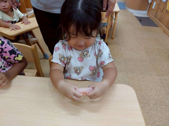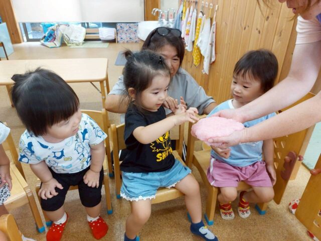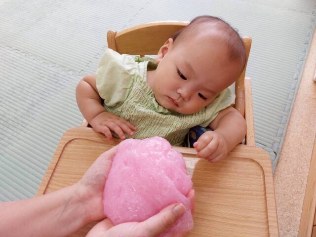 スライムを渡すと丸めたり、こねたりと夢中になって遊んでいました。