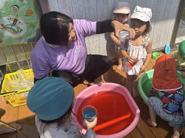 食紅で水に色を付けてあげると「わあ~」と驚きが。