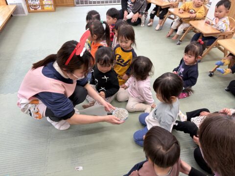 実際に大豆を見てみたり、豆腐を触ってみたりみんな興味津々!!