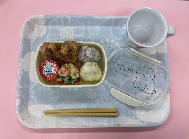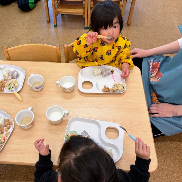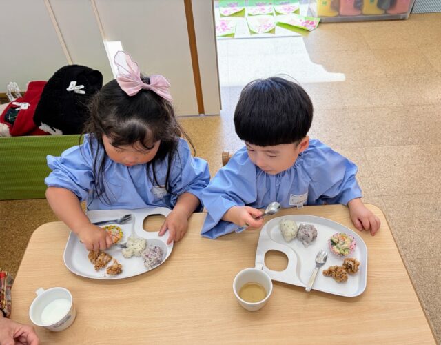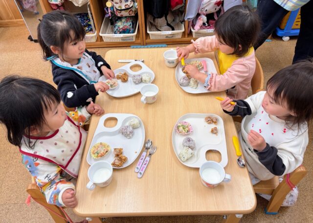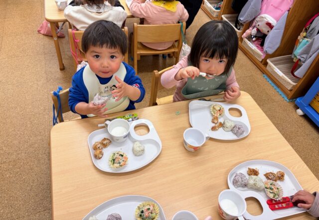 おにぎりはハート形、星形、クマ型にしたので『これはなんだろう?』と夢中で食べてくれました!!