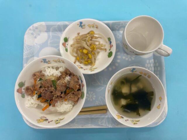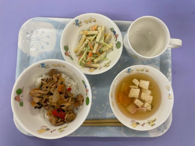 豚肉のみそ丼には中濃保育園のもも組さんが収穫してくれたピーマンがたくさん入っています☺