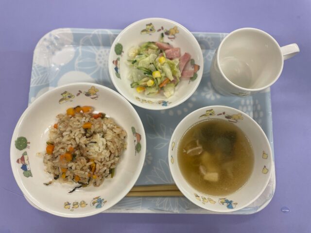 こまツナピラフは、小松菜・ツナ・たまねぎ・にんじんが入っています。