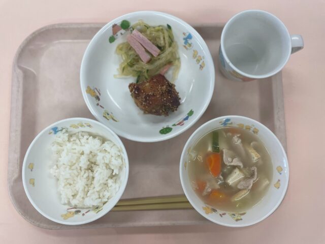 わかめスープには、わかめ・豆腐・鶏モモ肉・にんじん・キャベツ・ねぎ・ごまが入っていて具だくさんです。