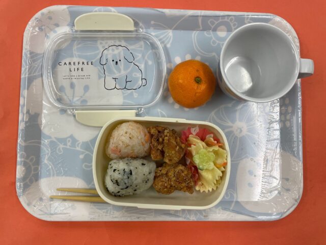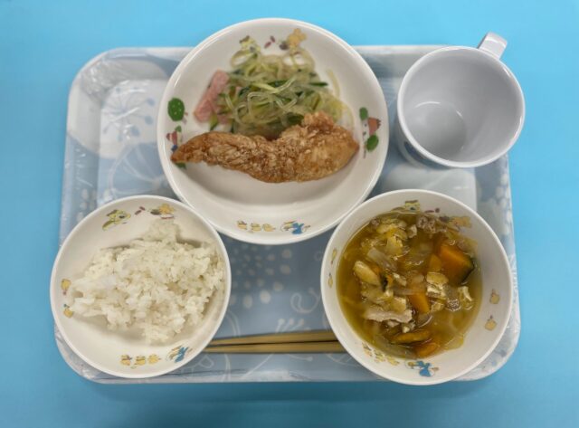今日はカレー味の鶏肉のから揚げ、リボン型のマカロニなど特別なメニューでした!