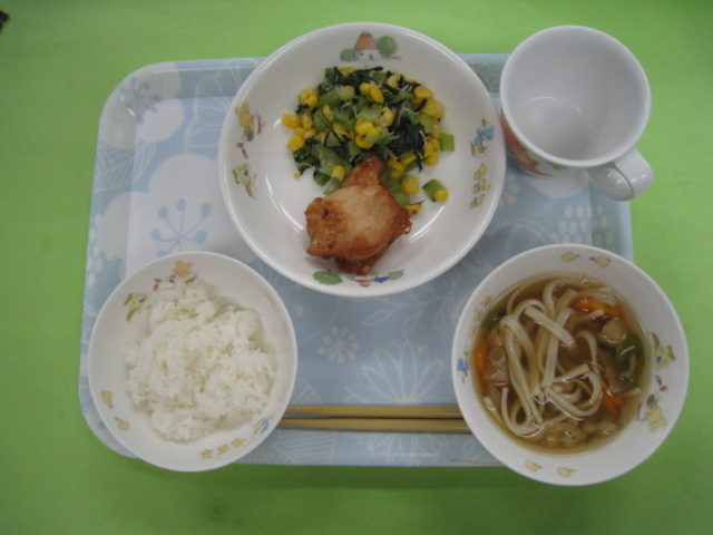 キャベツと春雨の中華スープは、みんなに人気の春雨が入っているのでツルツルとした食感を楽しみながら食べていました!