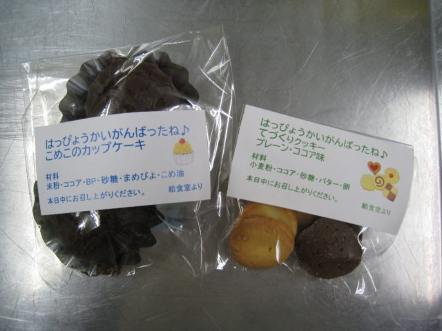 発表会を頑張ったみんなに給食室から、手作りクッキー(ノンアレルギー米粉のカップケーキ)をプレゼントしました!!