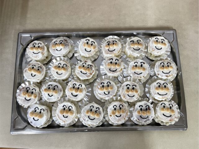 パウンドケーキを丸く、くり抜きアンパンマンの顔を作りました!