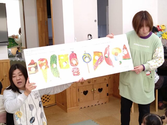 最後は「はらぺこあおむし」の大型絵本に合わせて読み歌い📚